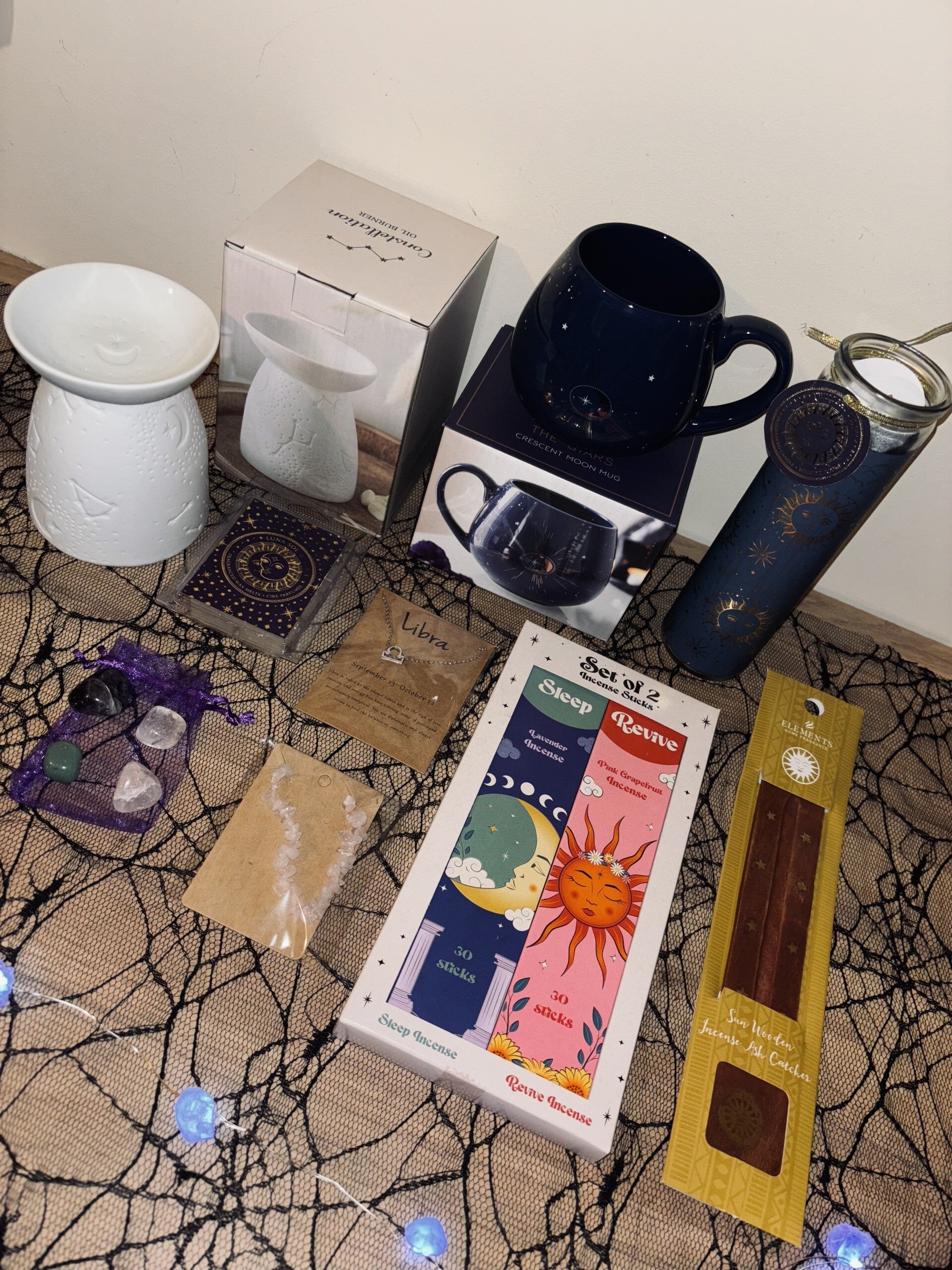 Inside, you’ll find a dazzling white celestial oil burner, a pack of cosmic celestial wax melts in the scent twilight sun, luna sol or celestial moon, and a cosmic mug to start your day off with mystical energy. Elevate your space with sun and moon incense, a matching incense ash catcher, and a sun and moon tube candle in vibrant purple, black, or blue. This box also includes a Libra zodiac necklace, four crystal tumble stones which resonate with your sign—amethyst, green aventurine, rose quartz, and clear quartz—and a rose quartz crystal bracelet. 🌙✨