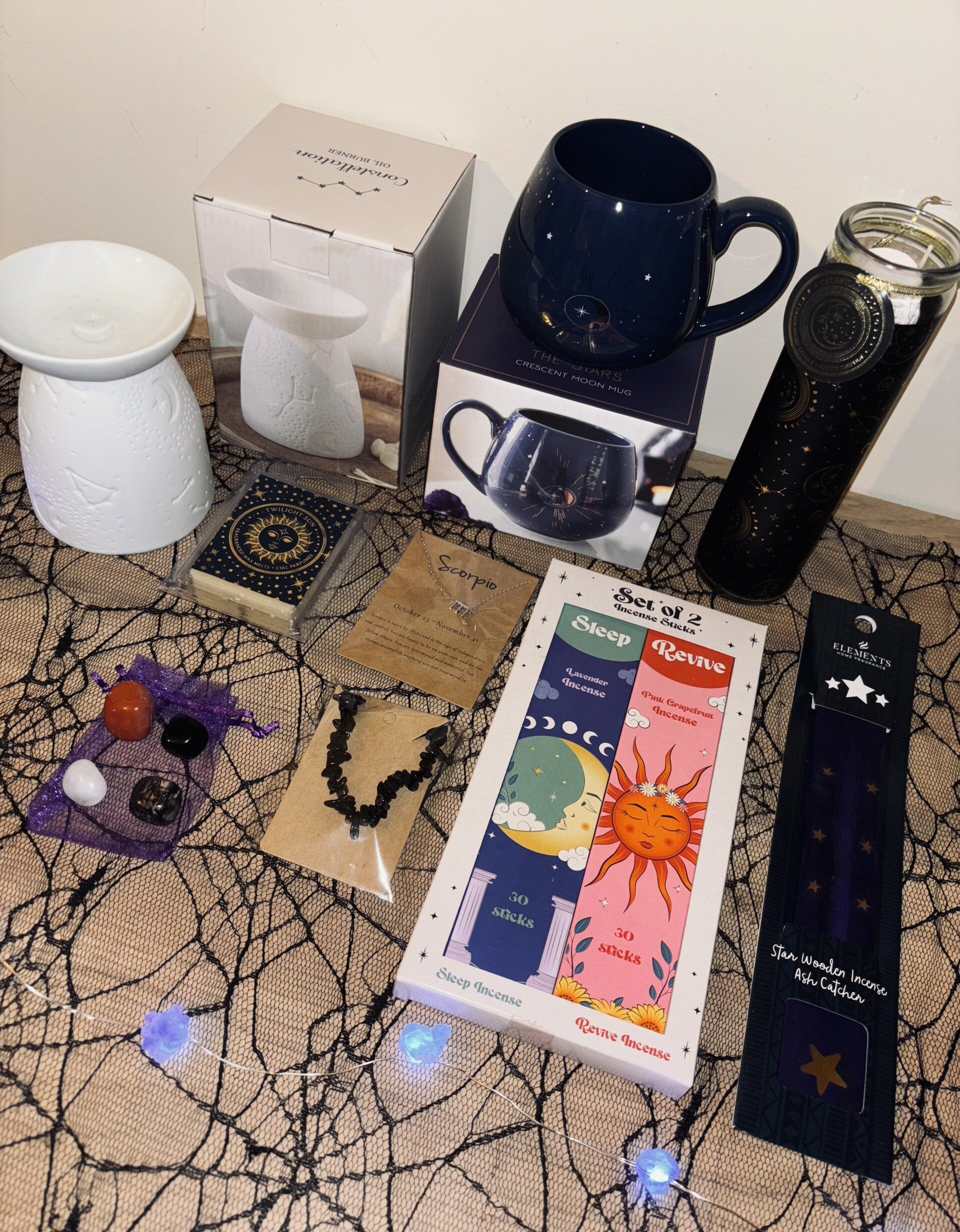Inside, you’ll find a dazzling white celestial oil burner, a pack of cosmic celestial wax melts in the scent twilight sun, luna sol or celestial moon, and a cosmic mug to start your day off with mystical energy. Elevate your space with sun and moon incense, a matching incense ash catcher, and a sun and moon tube candle in vibrant purple, black, or blue. This box also includes a Scorpio zodiac necklace, four crystal tumble stones which resonate with your sign—rhodonite, black obsidian, snow quartz, and red jasper—and a black obsidian crystal bracelet for protection and empowerment. 🌙✨